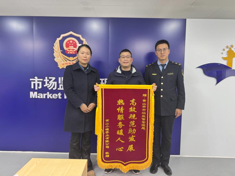 近日,黄山小罐茶叶有限公司负责人将印着“高效规范助发展,热情服务暖人心”的锦旗,送到黄山市市场监督管理局登记注册局,由衷感谢市场监管部门的优质高效服务。